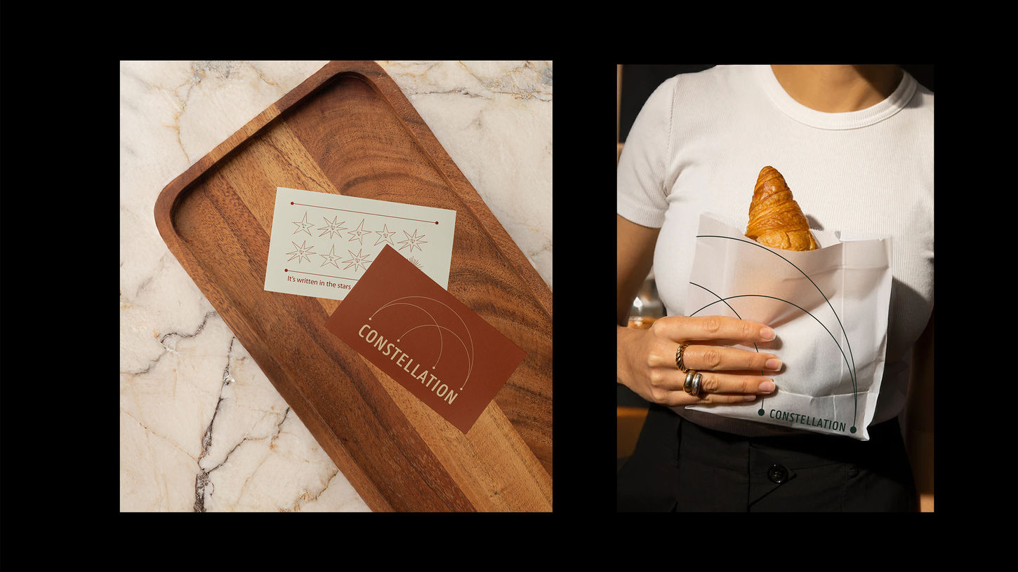 The guest experience was carefully designed to immerse visitors in the brand’s narrative. Packaging elements like coffee cups, loyalty cards, and tote bags feature playful celestial illustrations and minimalistic layouts, while environmental details such as illuminated celestial-inspired signage, arched seating nooks with copper finishes, and sleek menu boards enhance the café's ambiance. The tone of voice reflects Constellation’s ethos of cosmic wonder paired with grounded hospitality, creating an inviting, inspiring space where moments of discovery naturally lead to creativity and connection. These efforts positioned Constellation as both a neighbourhood hub and a distinctive element of the National Landing redevelopment.