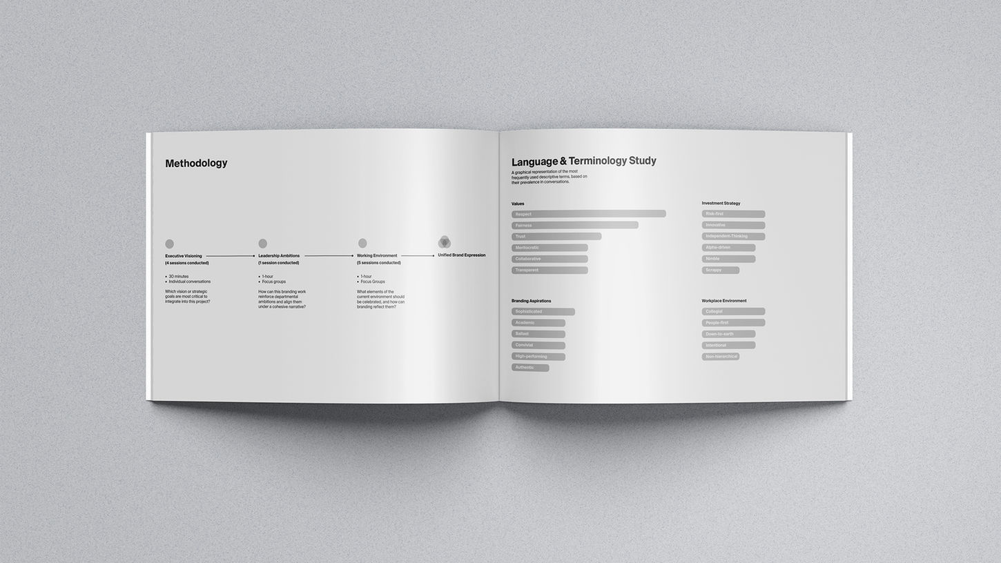 This narrative informed a refined visual identity, strategic communications guidance, and recommendations for aligning the firm’s workplace environments with its renewed ethos. From brand architecture to visual touchpoints, the system was designed to scale with confidence and consistency.